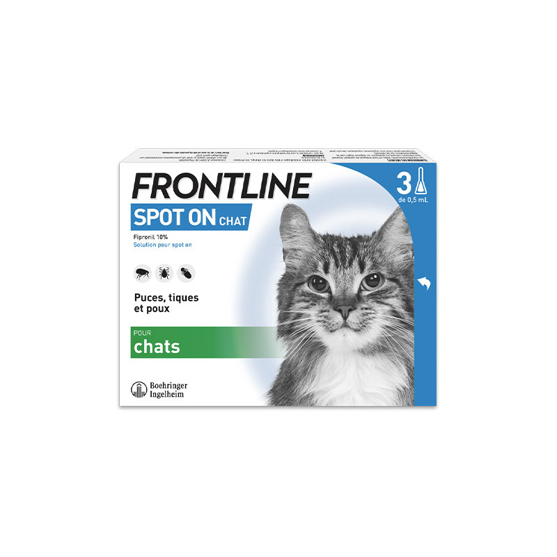 FRONTLINE SPOT ON CHAT est un médicament vétérinaire indiqué pour lutter contre les puces, les tiques et/ou les poux broyeurs chez les chats. Demandez conseil à votre pharmacien ou votre vétérinaire. Lire attentivement la notice. En cas de persistance des symptômes, consultez un vétérinaire. Ne pas utiliser chez les lapins. Se laver les mains après administration. Éviter tout contact avec l’animal tant que le site d’application n’est pas sec.