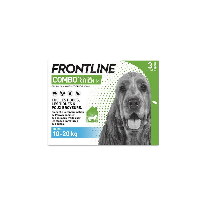 Frontline Combo Chien M est une solution pour Spot-on indiqué chez les chiens et chiennes de taille moyenne (entre 10 et 20 kg). Elle s'utilise contre les infestations par les puces, les tiques et/ou les poux broyeurs.