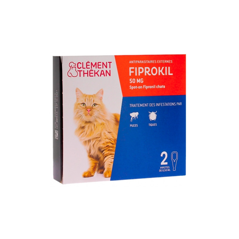 Clément Thékan Fiprokil 50 mg Chat 2 Pipettes traite les infestations par les puces (Ctenocephalides spp.) et les tiques (Dermacentor Reticulatus).
