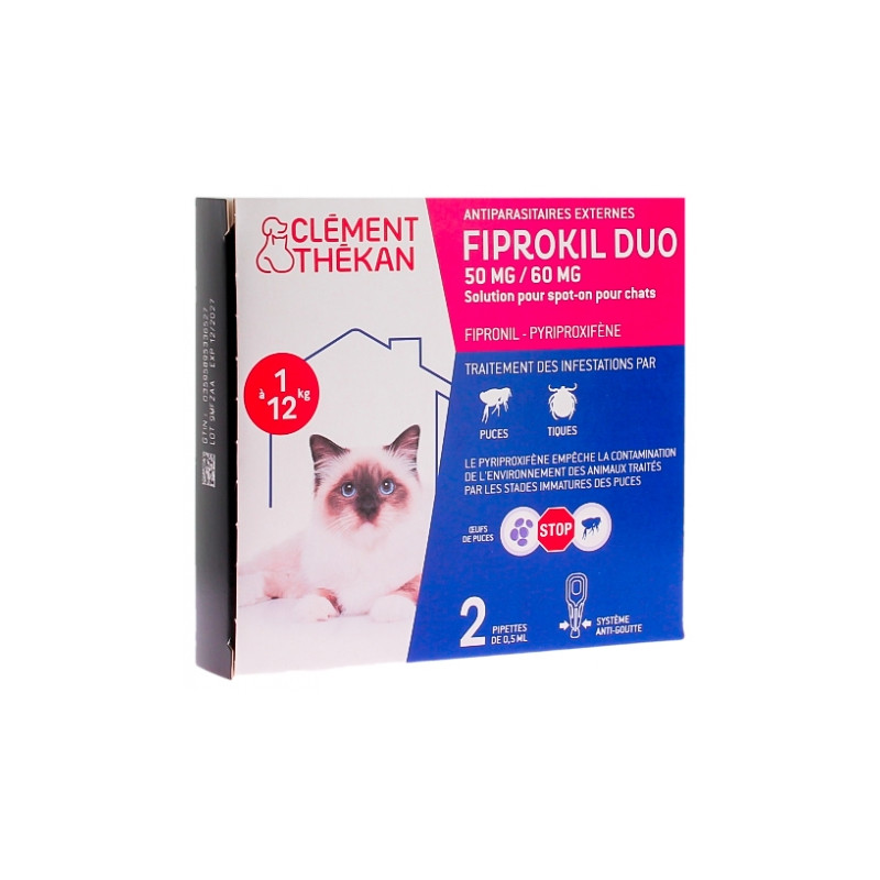 Clément Thékan Fiprokil Duo 50 mg/60 mg Antiparasitaire Chat 1 à 12 kg 2 Pipettes est un antiparasitaire externe à utiliser contre les infestations par les puces seules ou les infestations mixtes par les puces et les tiques chez le chat de 1 à 12 kg.