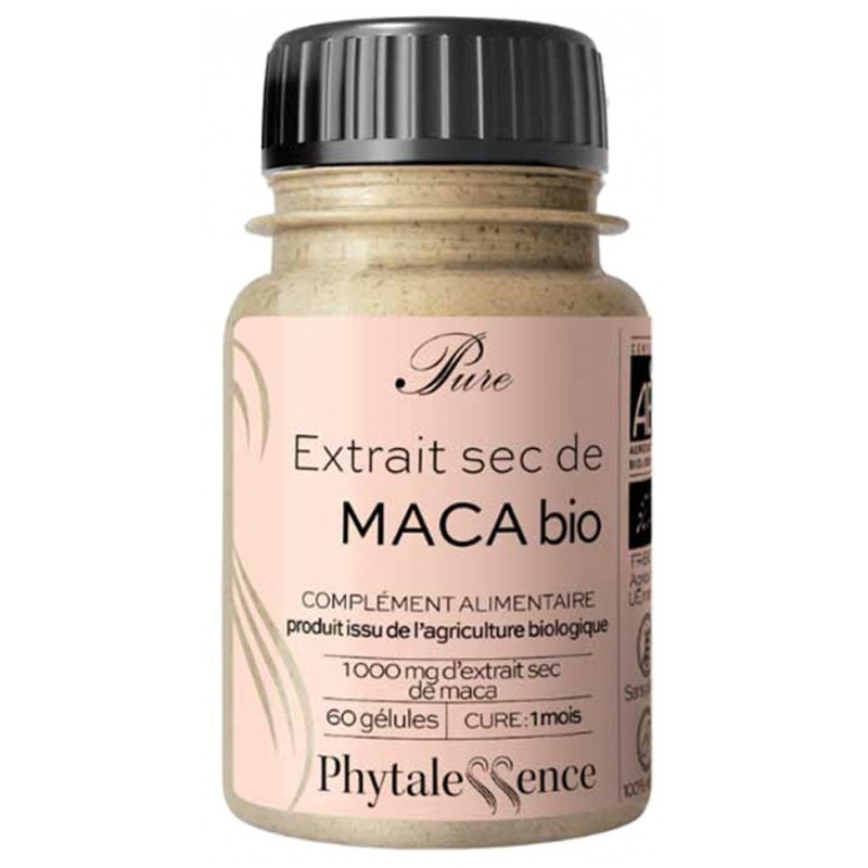 Phytalessence Pure Maca Bio 60 Gélules est un complément alimentaire à base d'extrait sec de maca Bio à hauteur de 1000 mg par gélule.
