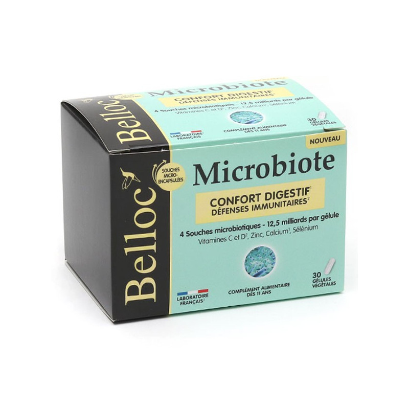 Microbiote 30 gélules est un complément alimentaire du laboratoire Belloc à base de souches microbiotiques : L. acidophilus NCIMB 30157, L. acidophilus NCIMB 30156, B. bifidum NCIMB 30153, B. animalis subsp lactis NCIMB 30172, de calcium, de vitamines D3 et C, de zinc et de sélénium.