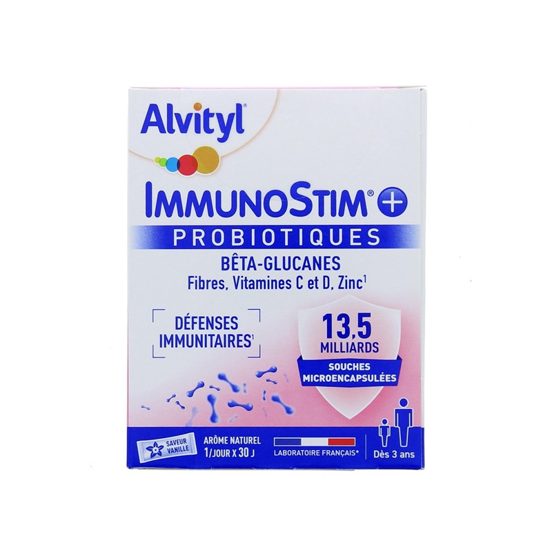 Le complément alimentaire Immunostim+ Probiotique de la marque Alvityl, contribue à l'équilibre de la microflore grâce à l'association des probiotiques, des bêta-glucanes, des fibres, des vitamines C & D et du Zinc. Ce complément convient à l'adulte, au sénior et à l'enfant âgé de plus de 3 ans.