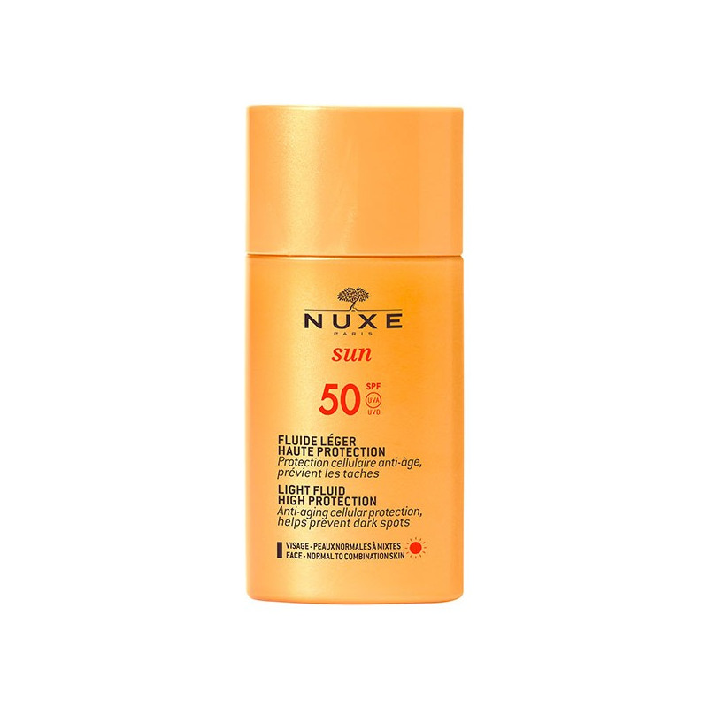 Nuxe Sun Fluide Léger Haute Protection SPF50 50ml est un produit solaire pour le visage conçu pour les peaux normales à mixtes.
