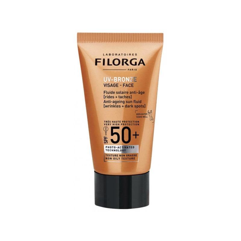 Filorga UV-BRONZE Visage Fluide Solaire Anti-Âge SPF50+ 40 ml est un soin solaire visage qui place la peau sous très haute protection et agit contre le vieillissement cutané et les taches pigmentaires. Il offre plusieurs actions : un bouclier anti-âge global [photo-activated technology] : un puissant extrait végétal actif sous les rayons du soleil, associé à des filtres UV, mettent la peau sous haute protection et agissent contre les signes du vieillissement cutané, une action anti-rides : la formule est enrichie en sulforaphane,