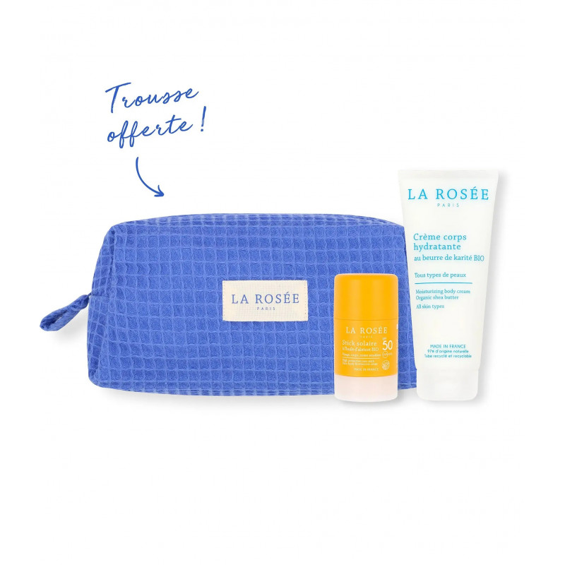 Notre Stick solaire SPF 50 et notre Crème corps hydratante 200 mL réunis dans une jolie trousse estivale : pour une peau protégée, intensément nourrie et un bronzage éclatant.