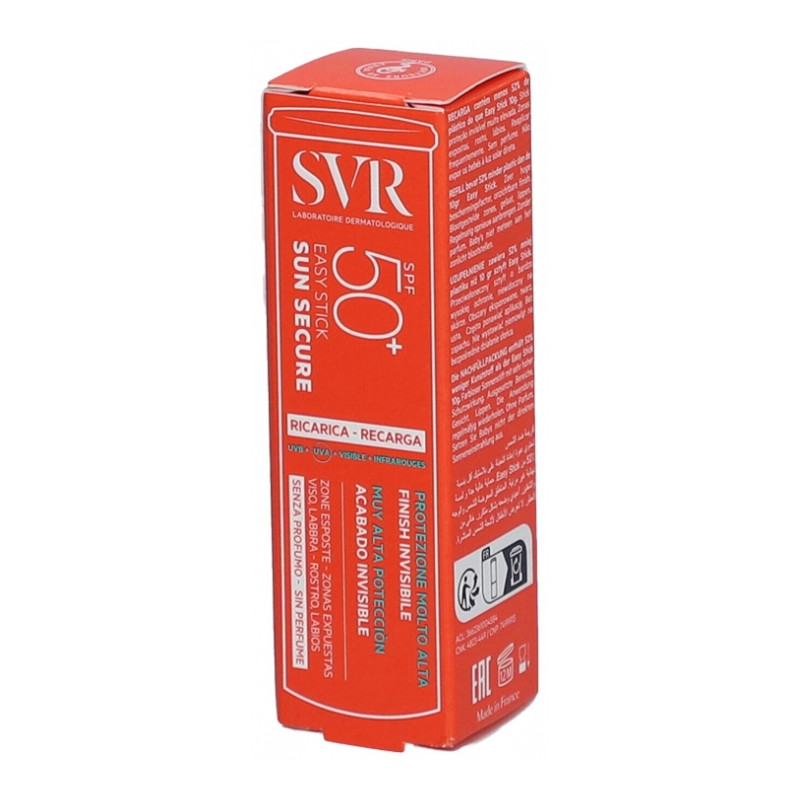 SVR Sun Secure Stick Recharge SPF50+ 10 g est un stick à très haute protection invisible pour peaux particulièrement sensibles dans un mini format de poche ultra nomade.