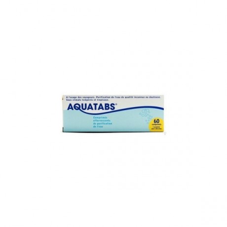 AQUATABS 60 COMPRIMES EFFERVESCENTS prévient les diarrhées et les troubles gastro-intestinaux en supprimant les micro organismes transmis par une eau contaminée. Ils sont également conseillés pour traiter l eau avant le brossage des dents, pour la boisson et pour le lavage des fruits et légumes. AQUATABS 60 COMPRIMES EFFERVESCENTS agit en 1/2 heure, et ce, pendant une durée de 24h. CONSEILS D UTILISATION : C est simple, car il suffit d ajouter 1 comprimé AQUATABS dans 1 litre d eau claire puis laisser agir 30 minutes avant de consommer. A noter qu il est d abord nécessaire de filtrer l eau douteuse avec un tissu fin avant de la traiter. Les 60 comprimés effervescents d AQUATABS peuvent être stockés pendant 5 ans à l abri de la lumière. COMPOSITION : dichloro-s-triazinetrione de sodium. Pour 1 litre d eau, il y a 3,5 mg de principe actif.