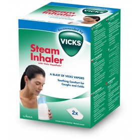 Steam Inhaler est un Inhalateur Vapeur des laboratoires Vicks. De petite taille, il peut vous suivre partout. Il mélange les senteur décongestionnantes et la vapeur d'eau chaude pour soulager la toux et les ruhmes. Sa forme entonnoir facilite la libération de la vapeur.Les vapeurs soulagent la congestion du nez et des sinus, elles pallient au dessèchement de la gorge.