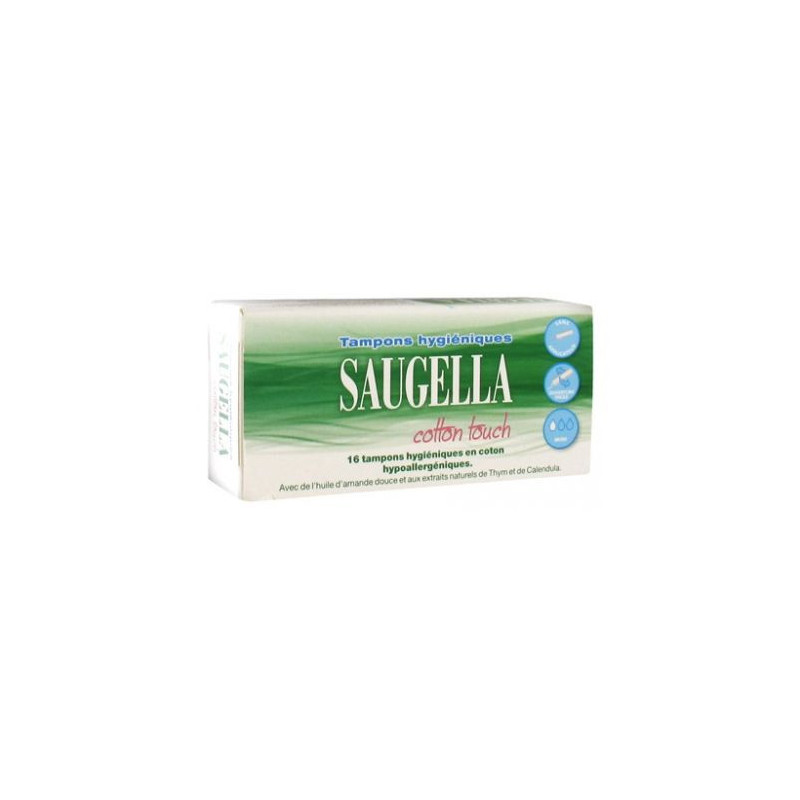 Saugella Cotton Touch 16 Tampons Hygiéniques Mini aux extraits naturels de Thym et de Calendula en coton et hypoallergéniques offrent une action anti-microbienne, anti-odeur et apaisante.