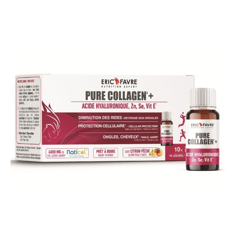 Avec Pure Collagen marin hydrolysé d'Eric Favre, offrez à votre peau l'éclat et la fermeté qu'elle mérite. Formule liquide prête à l'emploi associant 4 000 mg de collagène marin hydrolysé, acide hyaluronique, sélénium et vitamine E pour une action complète anti-âge.