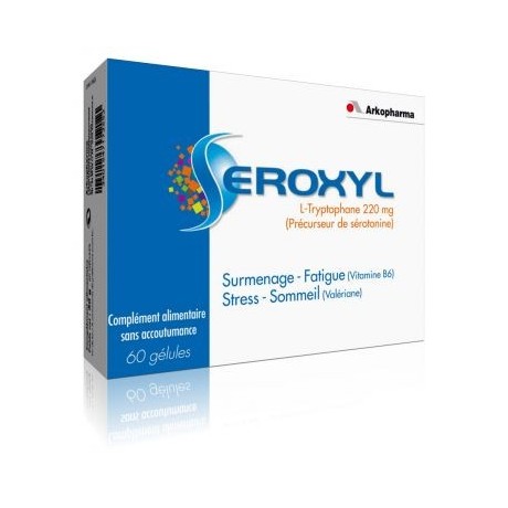 Réservé à l'adulte. Travail, mode de vie, surmenage… les origines du stress sont nombreuses. Le stress est une réaction de l'organisme qui conduit à la sécrétion de substances spécifiques permettant de faire face de manière plus ou moins adaptée. Les Laboratoires Arkopharma ont spécialement formulé Seroxyl, contenant de la Valériane, du L-Tryptophane et de la Vitamine B6. La Valériane vous aide lors de situations stressantes, ou de tensions provoquées par le stress. Elle contribue à la relaxation, favorisant ainsi le retour au calme en cas d'irritabilité, de surmenage. Une autre de ses propriétés est d'aider à préserver la qualité du sommeil. Le Tryptophane est un acide aminé essentiel, précurseur de la synthèse de sérotonine. La vitamine B6 contribue au bon fonctionnement du système nerveux. Elle contribue également à réduire la fatigue. Seroxyl est un complément alimentaire sans accoutumance.