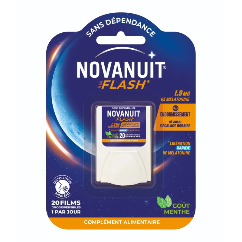 Novanuit Flash est un complément alimentaire réservé à l'adulte qui permet de réduire le temps d'endormissement et atténuer les effets du décalage horaire grâce à sa formule avec un fort dosage de mélatonine à 1,9mg et sa nouvelle galénique innovante et pratique en film orodispersible à déposer sur la langue. Le film orodispersible va fondre en quelques secondes pour être avaler après dissolution (sans eau) et libérer rapidement la mélatonine.