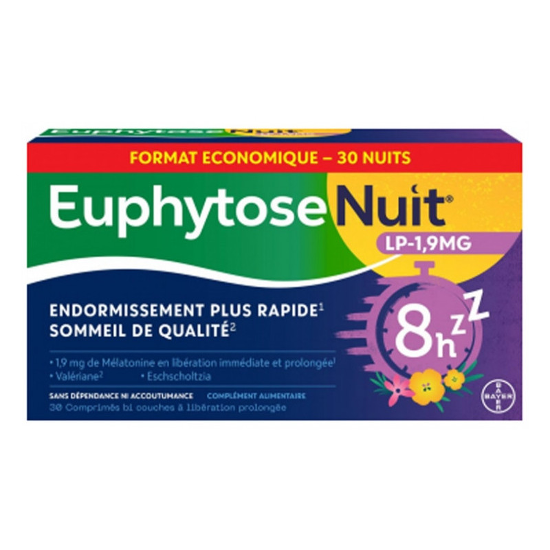 Bayer Santé Euphytose Nuit LP 1,9 mg 30 Comprimés est un complément alimentaire est un complément alimentaire à base de mélatonine et de plantes pour contribuer à une meilleure nuit de sommeil. Grâce à un comprimé bi-couche, il délivre : en libération rapide, une dose adaptée de mélatonine à 1 mg pour contribuer à réduire le temps d'endormissement. L'effet bénéfique sur l'endormissement est obtenu par la prise de 1 mg de mélatonine avant le coucher. L'eschscholtzia et la valériane aident à une relaxation optimale. en libération prolongée, de la valériane pour aider à maintenir un sommeil de qualité et à une relaxation optimale et 0,9 mg de mélatonine. La mélatonine se libère pendant au moins 8 heures.