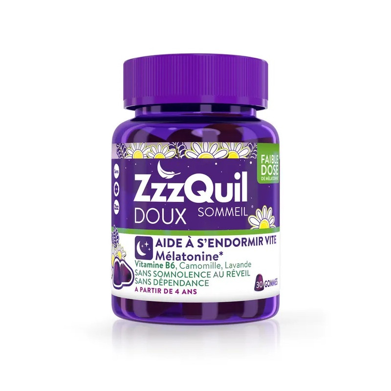 Les gommes à macher ZzzQuil Sommeil DOUX contiennent une faible dose de mélatonine, hormone du sommeil naturellement sécrétée par notre cerveau impliquée dans le cycle nycthéméral (alternance jour/nuit) qui aide à réduire le temps d'endormissement. L'association à la vitamine B6 permet de réduire la fatigue et le mélange d’extraits de plante camomille et lavande aideront à l'endormissement sans accoutumance ni de somnolence au réveil.