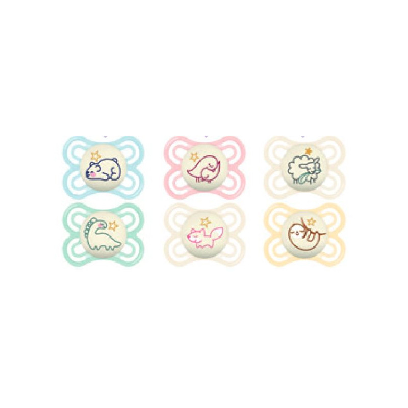 MAM 2 Sucettes Perfect Nuit 2-6 Mois - Modèle : Ours et Dinosaure sont des sucettes anatomiques conçues pour réduire le risque de mauvais alignement des dents et permettre le bon développement bucco-dentaire. La tétine est extra-fine pour que bébé puisse fermer sa bouche plus naturellement. Elle est en silicone SkinSoft™, facilement accepté par les bébés.