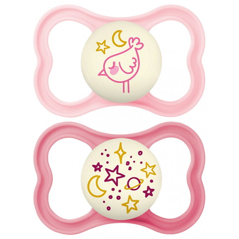 MAM 2 Sucettes Supreme Nuit 6 Mois et + sont des sucettes anatomiques brillant dans la nuit et conçues pour réduire le risque de mauvais alignement des dents. Leur forme aérée laisse respirer la peau de bébé. La forme extra fine et souple permet à bébé de fermer la bouche dans une position plus naturelle et confortable. Mam sucettes Supreme nuit en silicone pour les bébés à partir de 6 mois brillent dans la nuit et sont conçues pour réduire le mauvais alignement des dents.