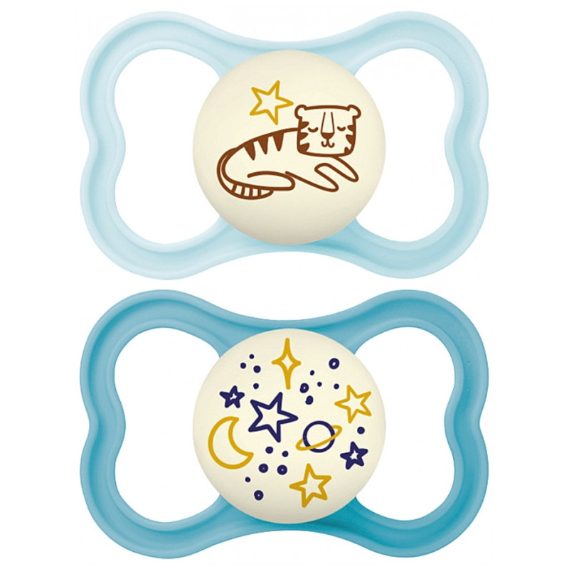 MAM 2 Sucettes Supreme Nuit 18 Mois et + - Couleur : Bleu sont des sucettes anatomiques brillant dans la nuit et conçues pour réduire le risque de mauvais alignement des dents. Leur forme aérée laisse respirer la peau de bébé. La forme extra fine et souple permet à bébé de fermer la bouche dans une position plus naturelle et confortable.