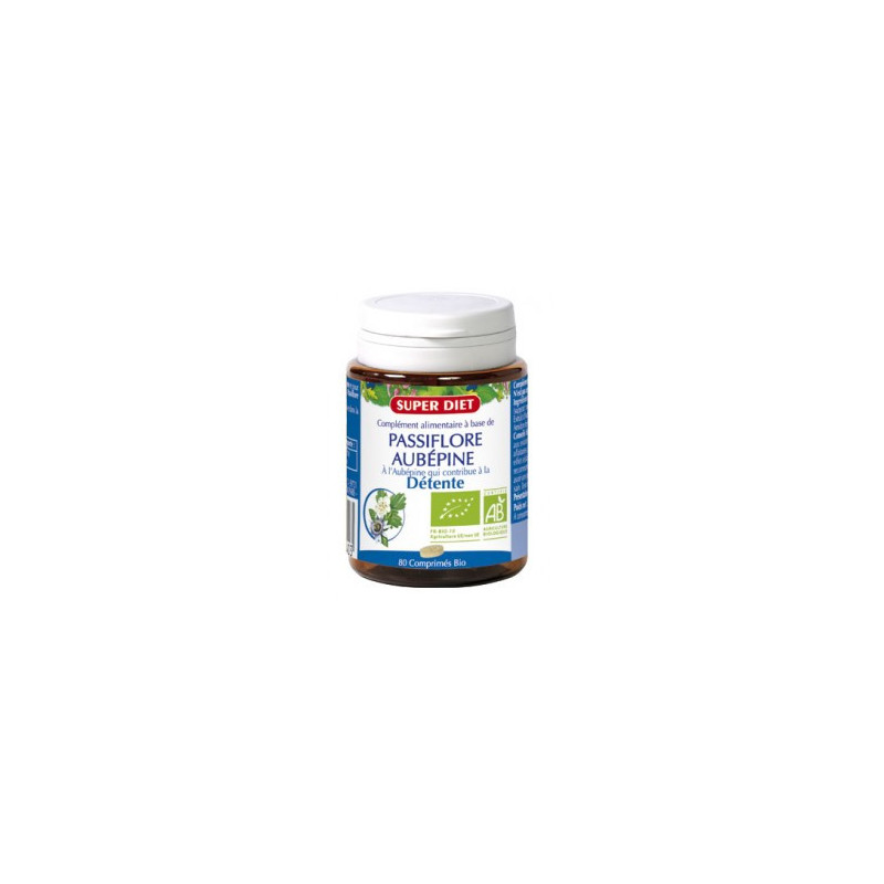 Super Diet Passiflore - Aubépine Bio - 80 Comprimés est un complément alimentaire à base de Passiflore et Aubépine.
