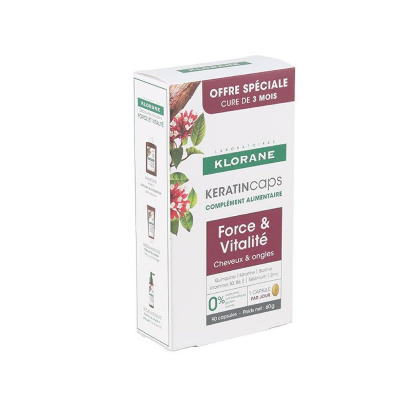 Klorane KeratinCaps Force et Vitalité capsules est un complément alimentaire pour les cheveux et les ongles associant quinquina + kératine.