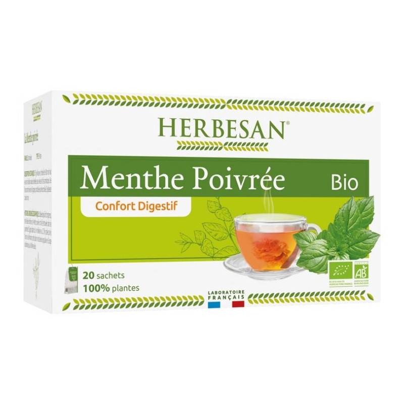 Herbesan Infusion Menthe Poivrée Bio 20 Sachets est une infusion monoplante à base de menthe poivrée bio qui contribue au confort digestif et aide à soutenir la digestion.