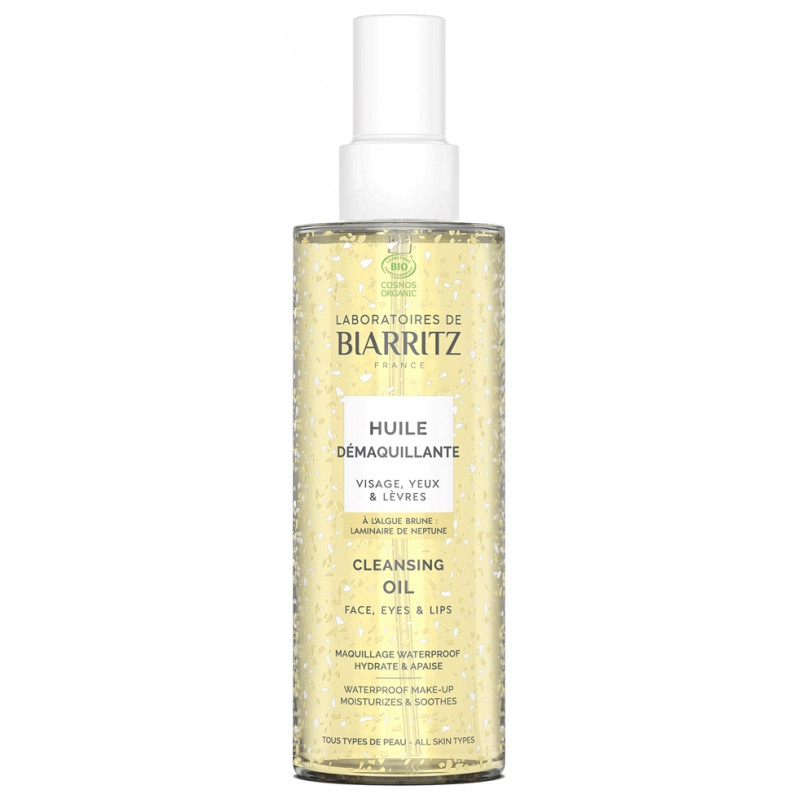 Laboratoires de Biarritz Huile Démaquillante Bio 200 ml est une huile qui démaquille, hydrate et apaise le visage, les yeux et les lèvres de tous les types de peaux, sans piquer les yeux.