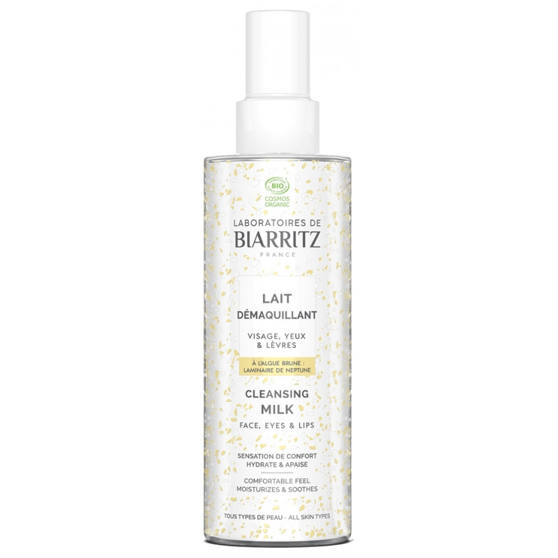 Laboratoires de Biarritz Lait Démaquillant Bio 200 ml est un lait qui démaquille, hydrate et apaise le visage, les yeux et les lèvres de tous les types de peaux, sans piquer les yeux.