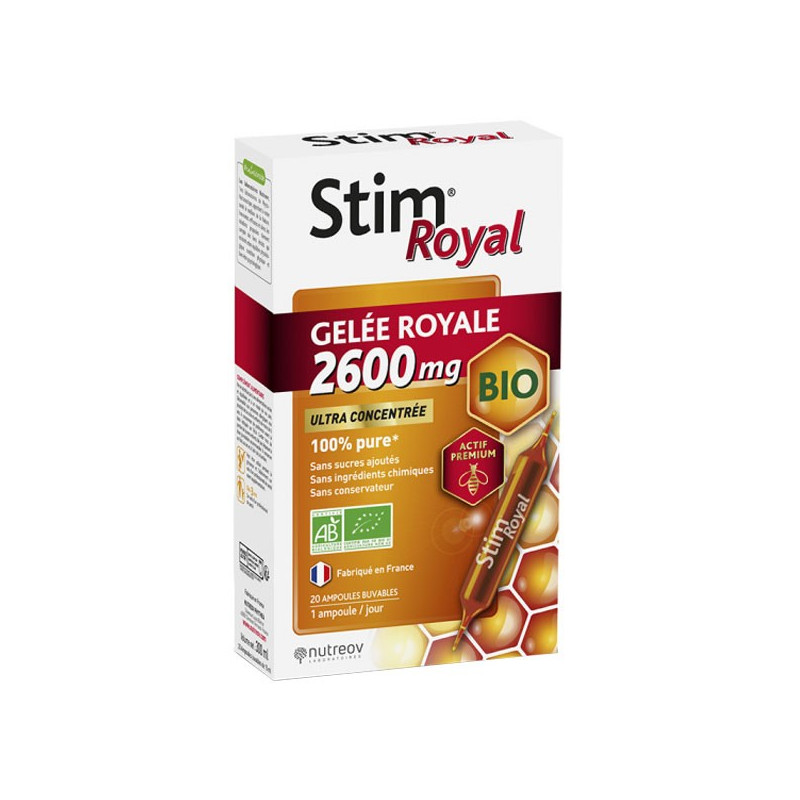 Stim Royal® GELÉE ROYALE BIO 2600 mg issu de la recherche des Laboratoires Nutreov est une formule ultra concentrée avec un dosage de 2600 mg de gelée royale fraîche, BIO, 100% pure et de qualité premium.
