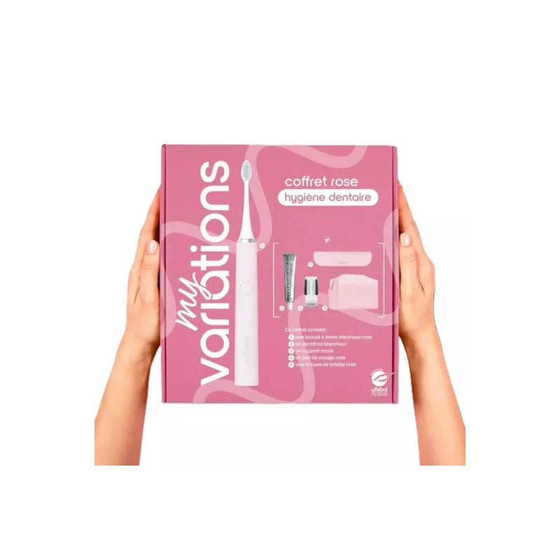 Coffret-cadeau brosse à dents électrique Pastel-Rose MyVariations, un ensemble premium comprenant une brosse à dents électrique, un étui de voyage, un support mural, un dentifrice blancheur et une trousse de toilette.