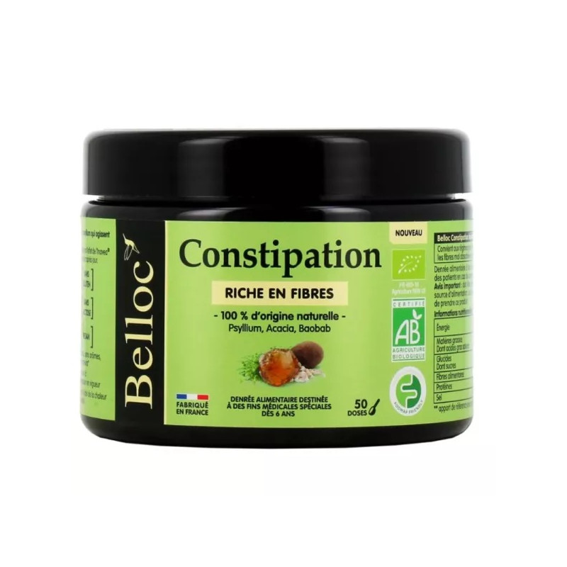 Belloc Constipation est une denrée alimentaire destinée à des fins médicales spéciales (DADFMS). Riche en fibres et 100 % d'origine naturelle, ce produit associe le psyllium, l'acacia et le baobab pour faciliter le transit intestinal et restaurer l'équilibre de la flore perturbée par la constipation.
