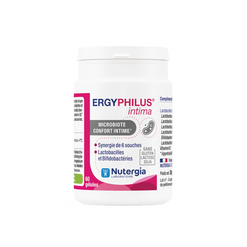 ERGYPHILUS® Intima (ERGYPHILUS® Fem pour la Belgique) est un complément alimentaire constitué d’une synergie unique de 6 souches revivifiables. Il contient des lactobacilles et bifidobactéries rigoureusement sélectionnés pour leurs propriétés :