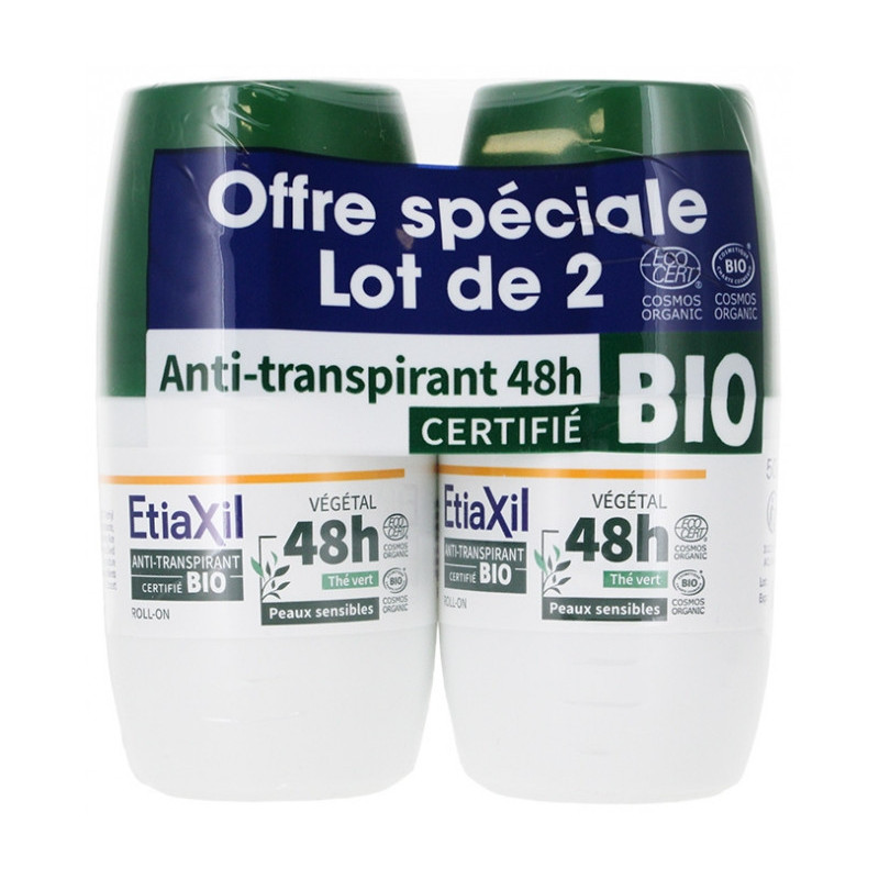 Etiaxil Déodorant Anti-Transpirant Végétal 48h Roll-On Bio Lot de 2 x 50 ml - Senteur : Thé Vert est un déodorant anti-transpirant formulé pour convenir aux peaux sensibles et pour des transpirations modérées. Il neutralise la transpiration modérée grâce aux pouvoirs de la pierre d'alun et la poudre de bambou, qui sont des actifs anti-transpirants et absorbants naturels. Les odeurs sont également neutralisées grâce aux sels de zinc qui captent les mauvaises odeurs. Le confort est optimal pour tous les types de peaux, même sensibles, tout en laissant un parfum doux et frais. Son format pratique vous permet de l'emporter partout très facilement.