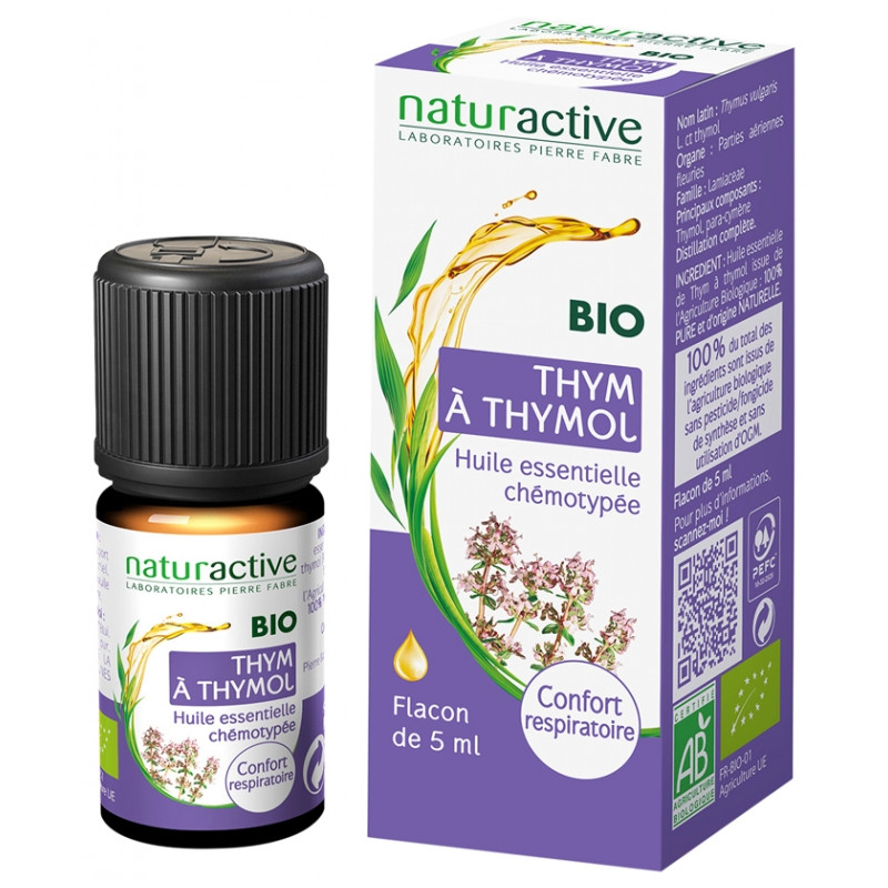 Naturactive Huile Essentielle Thym à Thymol (Thymus vulgaris L. ct thymol) Bio 5 ml est une huile essentielle chémotypée 100 % pure et d'origine naturelle, certifiée biologique. Elle est particulièrement indiquée pour le confort respiratoire.