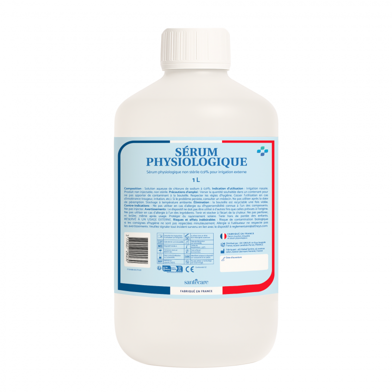 Le sérum physiologique en flacon de 1L permet d'irriguer et de nettoyer le nez. À utiliser avec une seringue nasale