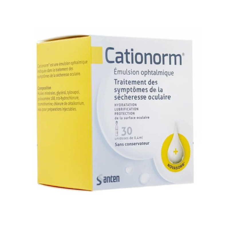L’émulsion ophtalmique Cationorm est indiquée dans le traitement des symptômes de la sécheresse oculaire. Aussi appelée « les yeux secs », cette sécheresse qui se manifeste par une plus grande sensibilité de l’œil à la lumière, par une difficulté à ouvrir les paupières le matin ou encore par la désagréable sensation d'avoir en permanence des poussières dans les yeux, est généralement due à un déficit, voire à une absence, de larmes.