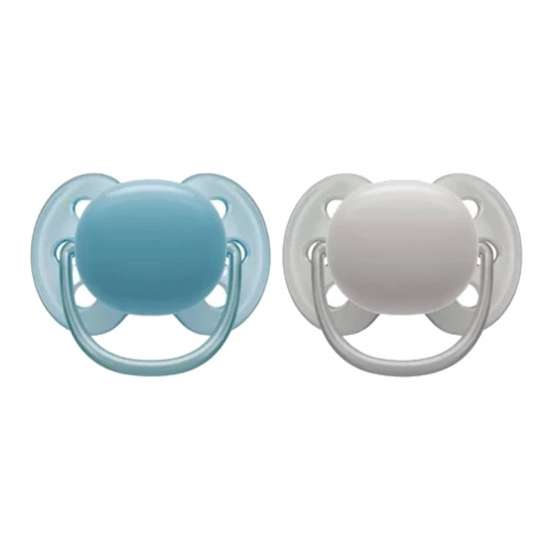 Avent Ultra Soft 2 Sucettes Orthodontiques Silicone 6-18 Mois - Couleur : Bleu Vert/Gris est un lot de deux sucettes orthodontiques avec une collerette flexible pour une peau douce pour éviter les marques et les irritations sur la peau. Ces 2 sucettes sont fournies dans un étui pratique pour le transport et la stérilisation.